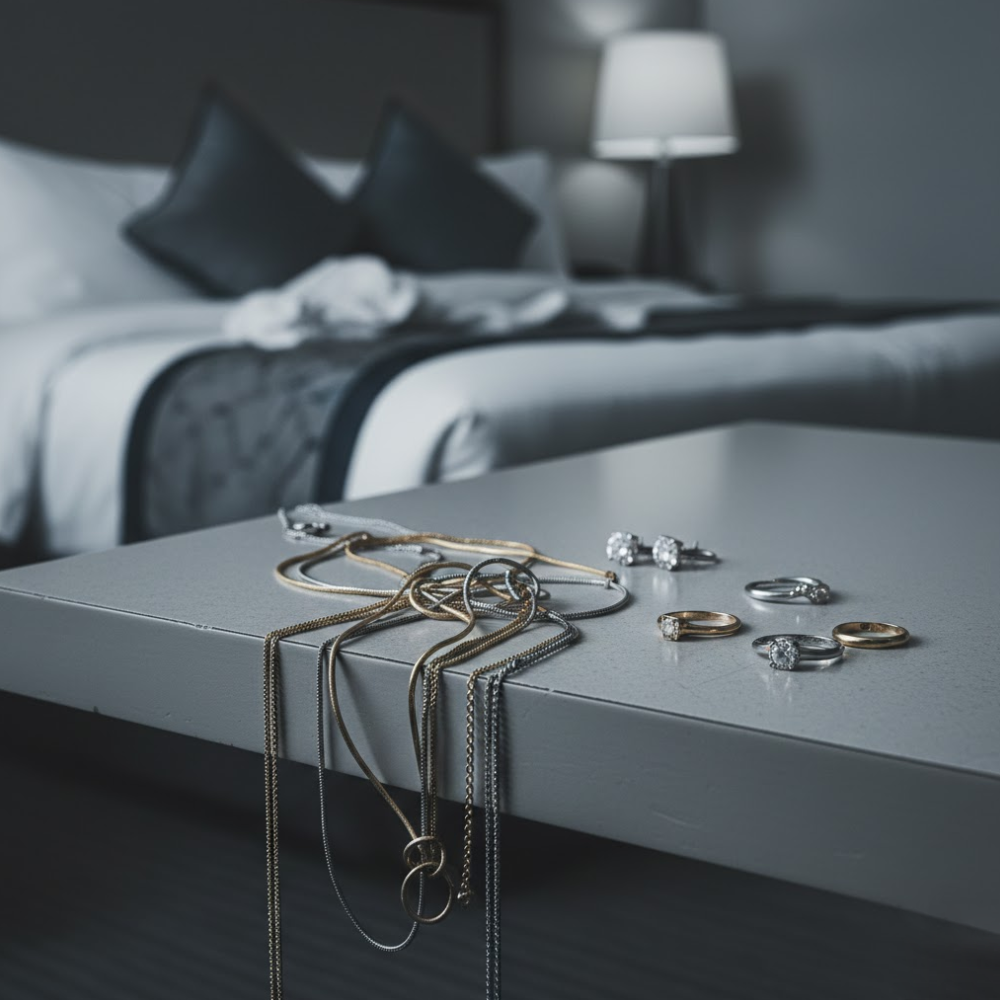 Removable compartments allow flexible storage for rings, earrings, and necklaces.